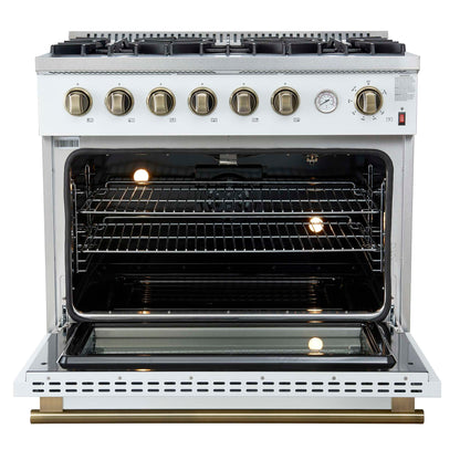 Forno Galiano 36-inch Freestanding Gas Range in White with Antique Brass Design, 6 Burners, 83,000 BTU, 5.36 cu.ft. Convection Oven