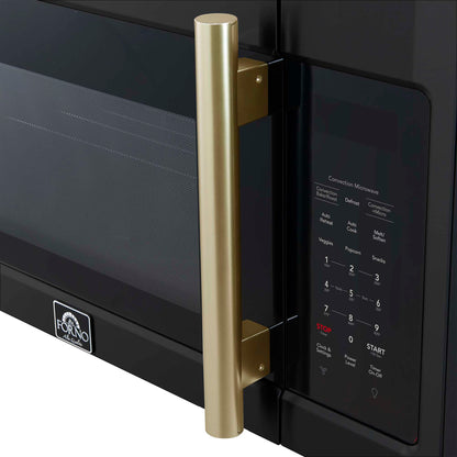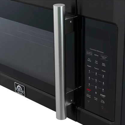 The Fornace 30" Over the Range Microwave in Black combines microwave, convection, and speed cooking functions in one versatile appliance. Designed to be smudge-resistant, it features a sleek digital display, LED lighting, and an easy-to-clean washable filter. Touchpad controls and auto menu programs make everyday cooking simple, while multistage and cook time options offer precision. A durable plastic handle in antique brass ensures a comfortable, cool-to-touch grip. With vertical, horizontal, and recirculating air discharge options, plus a powerful two-speed blower system (105/300 CFM), this undercabinet or wall-mounted microwave is a modern solution for efficient and reliable cooking.