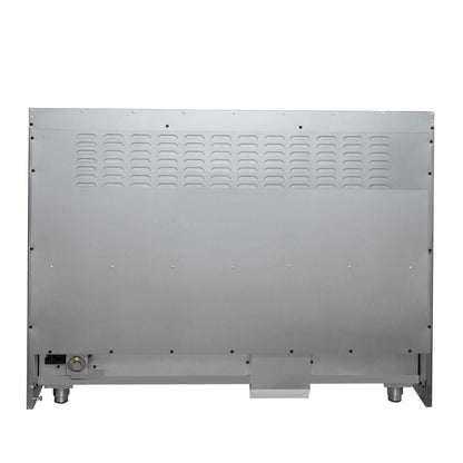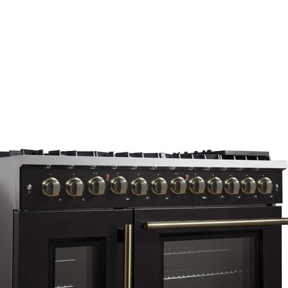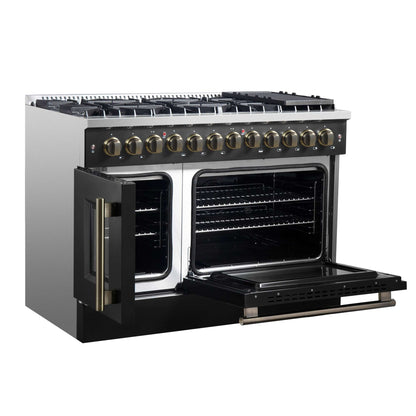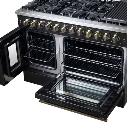 The 48" Galiano Dual Fuel French Door Range blends timeless design and high performance. Featuring a sleek black finish and antique brass knobs, this range adds sophistication to any kitchen at an affordable price. The cooktop boasts eight sealed burners with a total output of 107,000 BTU, including a 20,000 BTU dual-ring burner ideal for boiling, searing, or simmering delicate sauces. Heavy-duty cast iron grates provide a stable surface and allow smooth sliding of cookware. Its spacious 6.58 cu.ft. true convection oven delivers even heat distribution, powered by 9,700 watts. French door convenience, easy-to-clean black enamel interiors, electroplated racks, an LP conversion kit, and NEMA 14-50 power cord make this range practical and stylish.