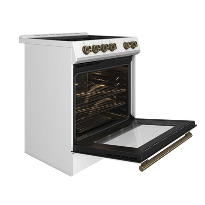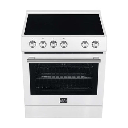 Introducing the Forno Leonardo Espresso 30" 5.0 cu. ft. White Electric Range, a kitchen game-changer. Featuring antique brass accents, 4 radiant elements, and a 5,500-watt convection oven, it combines style with top-notch performance. Antique brass knobs and handles add elegance, while the ceramic glass cooktop ensures even heat distribution. The hidden bake element simplifies maintenance by preventing spills and odors. This timeless, user-friendly range offers durability, sophistication, and efficiency in every use.