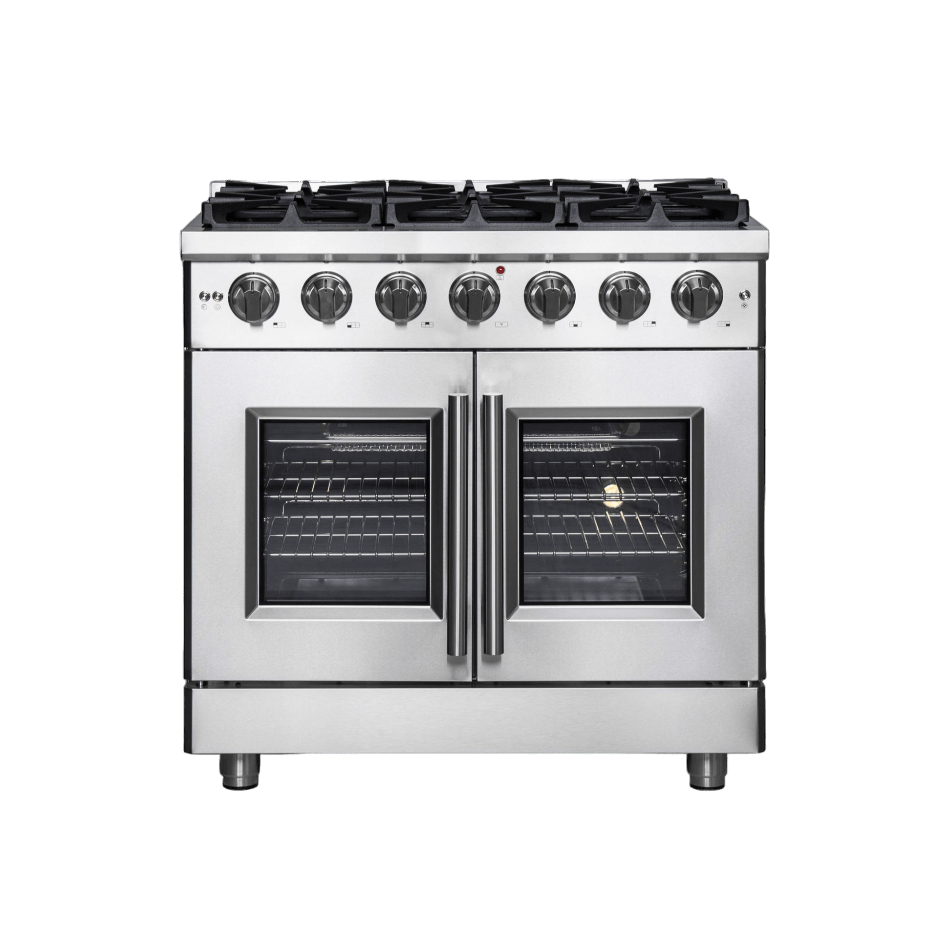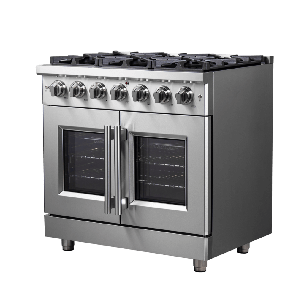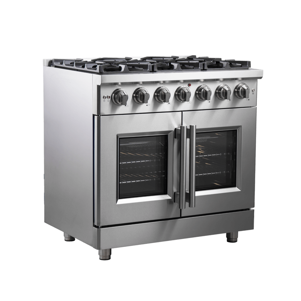 The 36” Forno French Door Gas Range brings professional styling and Performance into your home kitchen with its durable stainless-steel design. Unique french doors mean open doors allow up to 12" or more space to access your oven. The gas rangetop has 5 sealed dual-ring burners. The heavy-duty continuous cast iron grates allow maximum stability of cookware mobility over a recessed enamel Cooking Surface which keeps spills and splashes contained and easy to clean. The 5.36 cu. ft. gas oven with a total output of 30,000 BTU is encased in a speckled blue enamel interior fitted with a convection fan, ensures to achieve fast, precision and consistent oven cooking along for easy viewing is a 3-layer glass oven door window. Included is an LP conversion kit, 2 stainless steel telescopic oven racks, wok-ring, reversible griddle, air fry basket with rack and drip pan. Additionally, zinc coated metal knobs with bezel rings will maintain their beauty for years. All FORNO products come with a 2 year warranty.