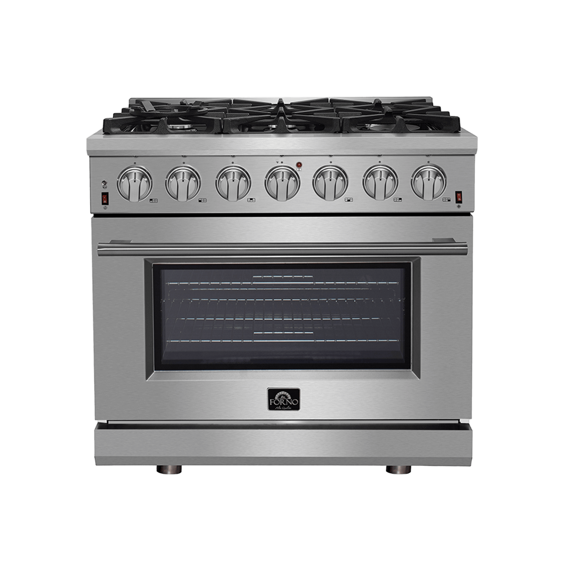 The 36” Forno All Gas Range brings professional styling and Performance into your home kitchen with its durable and beatiful 304 grade stainless-steel design. Cooking surface has 6 sealed burners with a total output of 83,000 BTU including 1 sealed dual-ring burner for simmering melting chocolate or cooking sauces, 20K dual-ring burner for boiling or searing and is able to perform simmering like melting chocolate or sauces, Continuous cast iron grates allow maximum stability of cookware mobility over a recessed enamel Cooking surface cavity which keeps spills and splashes contained and easy to clean. This 4.32 cu.ft. convection fan oven has an impressive blue enamel interior, allowing for easy cleaning. The 3-layer glass oven door window provides both heat retention and an unobstructed view. This oven also boasts a total output of 26,000 BTU, providing plenty of power for baking, roasting, and broiling. Included are 2 fully telescopic easy access stainless steel oven racks, concave Wok Ring and LP conversion kit. Additionally, zinc coated metal knobs with bezel rings will maintain their beauty for years. The 6239 series is limited distribution.