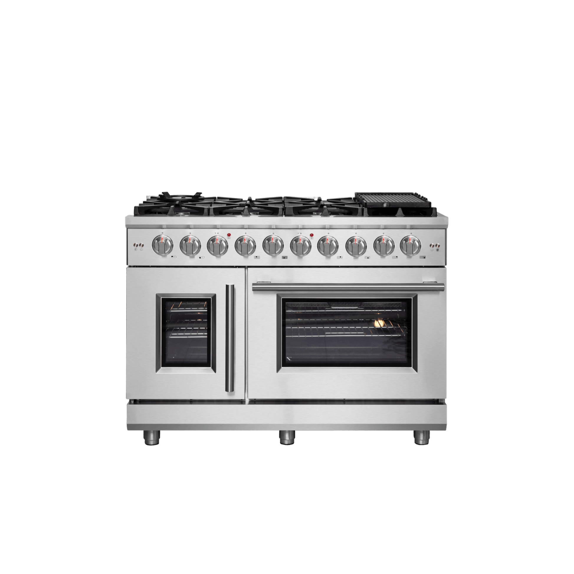 The 48” Forno French Door Gas Range brings professional styling and Performance into your home kitchen with its durable stainless-steel design. The gas rangetop has 8 sealed. The heavy-duty continuous cast iron grates allow maximum stability of cookware mobility over a recessed enamel Cooking Surface cavity which keeps spills and splashes contained and easy to clean. Double gas ovens have a combined 6.58 cu.ft. capacity with a total output of 44,000 BTU. encased in a speckled blue enamel interiors and tempered 3-layer glass oven door windows. Right-side oven consists of a convection fan function. Included is an LP conversion kit, 4 stainless steel telescopic oven racks, wok-ring, reversible grill/griddle, air fry basket with rack and drip pan. Additionally, zinc coated metal knobs with bezel rings will maintain their beauty for years.