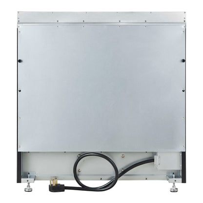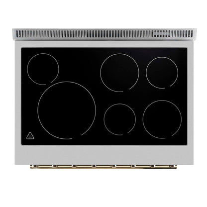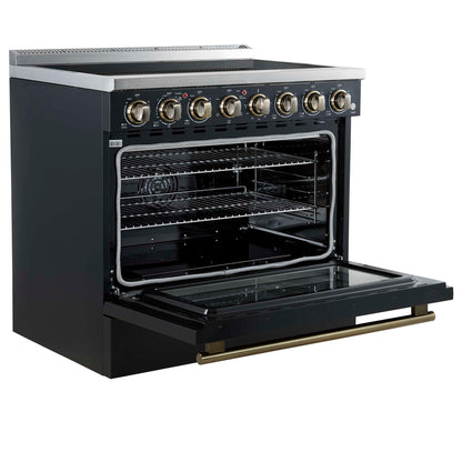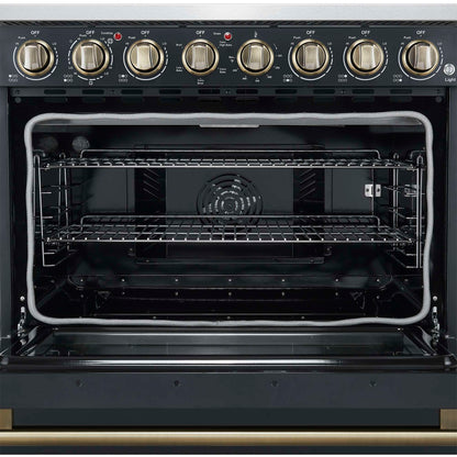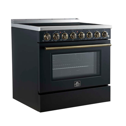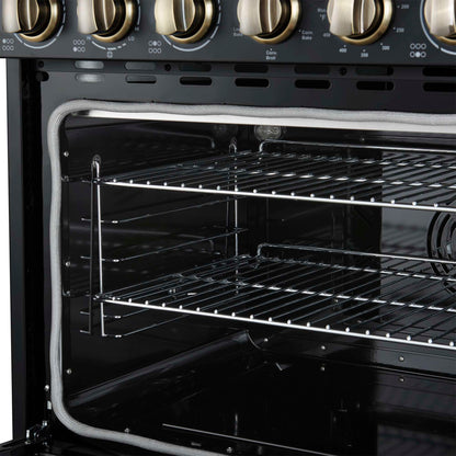 The Forno Paolo 36" electric range in black with antique brass knobs and handles combines power and style for the modern kitchen. Its smooth ceramic glass cooktop features five radiant elements with 9,800 watts of total output. The 5.44 cu. ft. true convection oven delivers fast, even results with a 1,200-watt fan and 3,000-watt high-powered baking and broiling elements. Additional features include a hidden bake element, bright halogen lights, a large viewing window, 100-watt warming zone, and dual-element broiler for precise, high-heat cooking. Antique brass knobs and handles add timeless style, creating a striking contrast against the black finish.