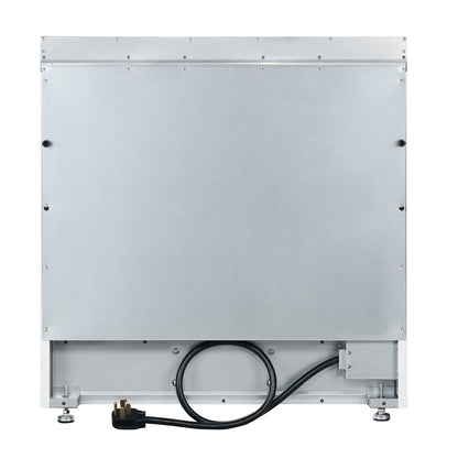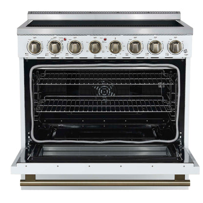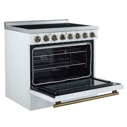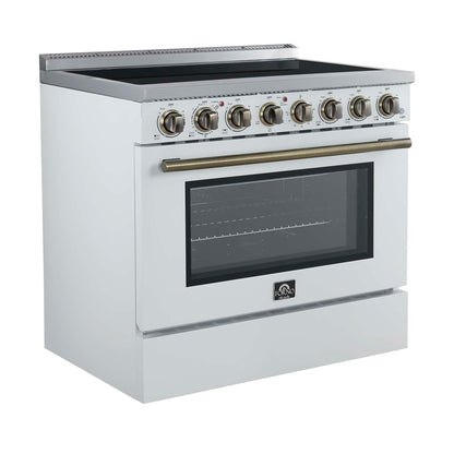 The Forno Paolo 36" electric range in white with antique brass knobs and handles combines power and style for the modern kitchen. Its smooth ceramic glass cooktop features six radiant elements with 9,800 watts of total output. The 5.44 cu. ft. true convection oven delivers fast, even results with a 1,200-watt fan and 3,000-watt high-powered baking and broiling elements. A hidden bake element, bright halogen lights, and a large viewing window add convenience. This freestanding electric range also includes a 100-watt warming zone and dual-element broiler for precise, high-heat cooking.