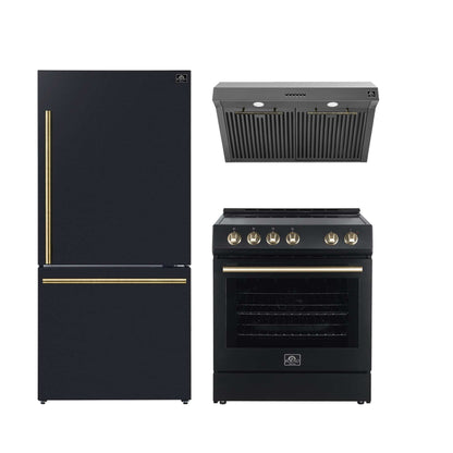 Upgrade your kitchen with the FORNO Premium 3-Piece Kitchen Bundle. This set includes the Leonardo Espresso 30" Black Electric Range, the 30" Black Under Cabinet Range Hood, and the 31" Black Bottom Freezer Refrigerator. Each appliance showcases a bold black finish, combining refined aesthetics with powerful performance to bring elegance and efficiency to your home kitchen.