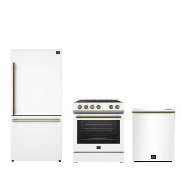 Upgrade your kitchen with the FORNO Premium 3-Piece Kitchen Bundle. This bundle includes the Leonardo Espresso 30" White Electric Range, the 31" White Bottom Freezer Refrigerator, and the 24" White Built-In Dishwasher. Each appliance features a sleek white finish, combining elegance and high performance.