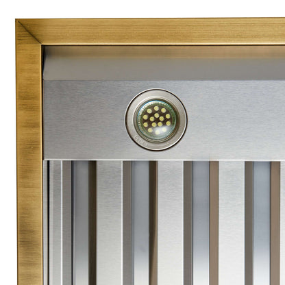 Designed for both style and performance, the Vittorio 48" Range Hood keeps your kitchen fresh with a 600 CFM motor that efficiently removes smoke, grease, and odors. The three-speed fan control adapts to various cooking needs, while dishwasher-safe baffle filters ensure easy maintenance. Enjoy seamless operation with touch and remote controls, and brighten your cooking space with energy-efficient LED lighting. Engineered for low-noise performance, it allows for a peaceful kitchen environment. With its sleek black finish and antique brass accents, the Vittorio brings vintage charm to any kitchen design. The versatile installation suits both wall-mounted and under-cabinet setups, while the 3-minute power-off delay ensures continuous ventilation even after cooking.
