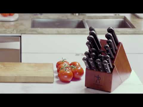 The Solution 18-piece knife block set features a distinctive set of high-quality knives, to set your kitchen up right. The set includes the all-rounder 8-inch chef’s knife for chopping onions and cutting meat, the 4-inch paring knife, ideal for peeling vegetables, and the 5-inch serrated utility knife, handy for cutting soft interior, hard exterior foods. This set is completed with kitchen shears and a sharpening steel, all stored in a handsome hardwood block that features 8 steak knives.