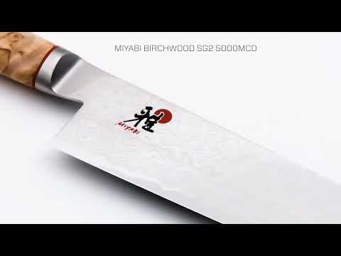 Miyabi continues to strive for perfection with the introduction of Birchwood SG2. This next generation of Miyabi knives combines the greatest hardening technology, most precious knife materials, and the artistry of traditional craftsmanship. The SG2 blade is protected by an intricate, 101-layer Damascus pattern and the Karelian (Masur) Birch handle features a striking mosaic pin, red spacer accents, and a steel end cap. Manufactured in Seki, Japan.